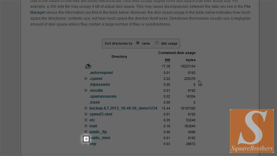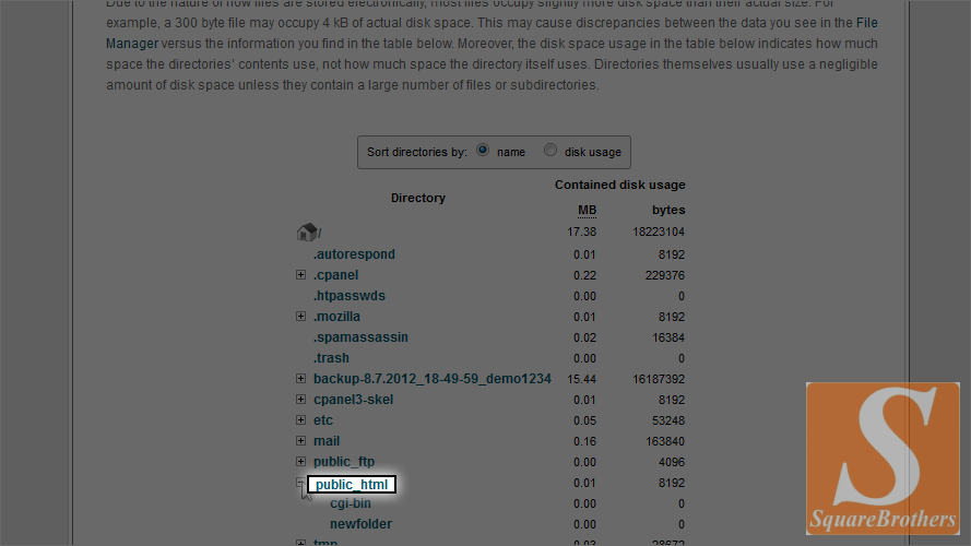 From here you can see how much storage space (or disk space) is being used by each directory and sub-directory in your account